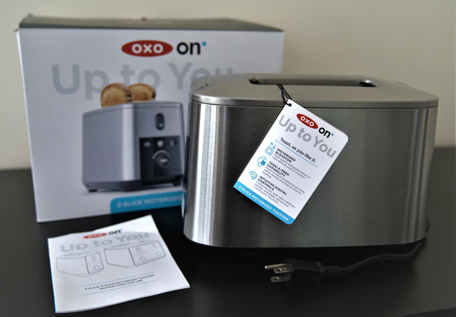 Oxo on 2 slice lever free motorized toaster.