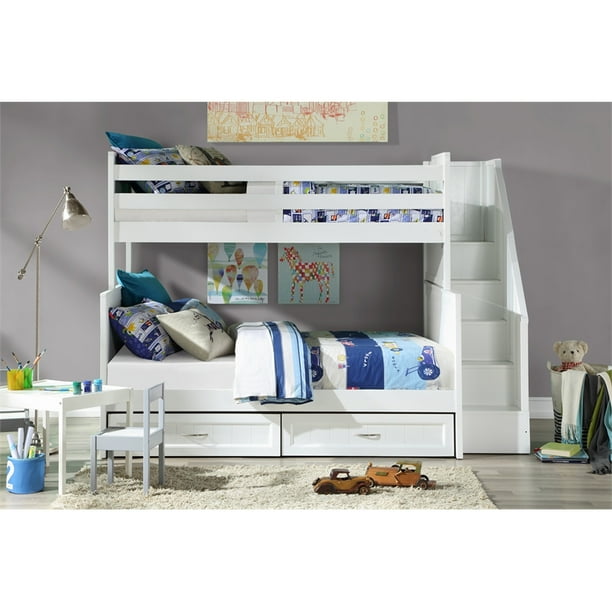 A large drawer under the bottom bunk can be used for storage of clothing or toys or you can add a 5 mattress for guest sleeping space.