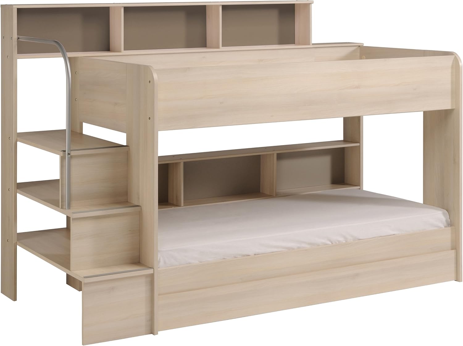 The kids avenue bibop 2 bunk bed in an acacia finish by parisot features reversible soft pink and cappuccino coloured shelving back panels and a sturdy 3 step staircase with a metal hand rail for safe and easy access to the top bunk.